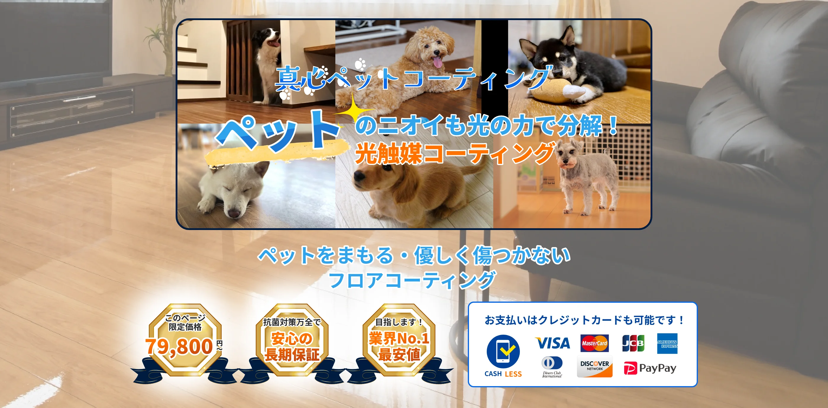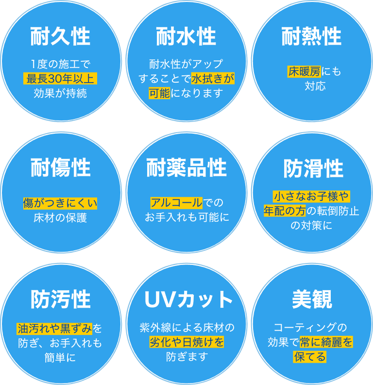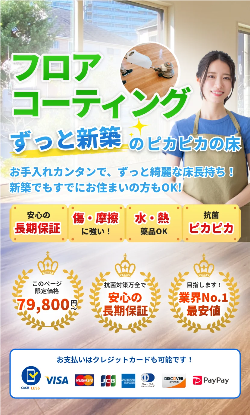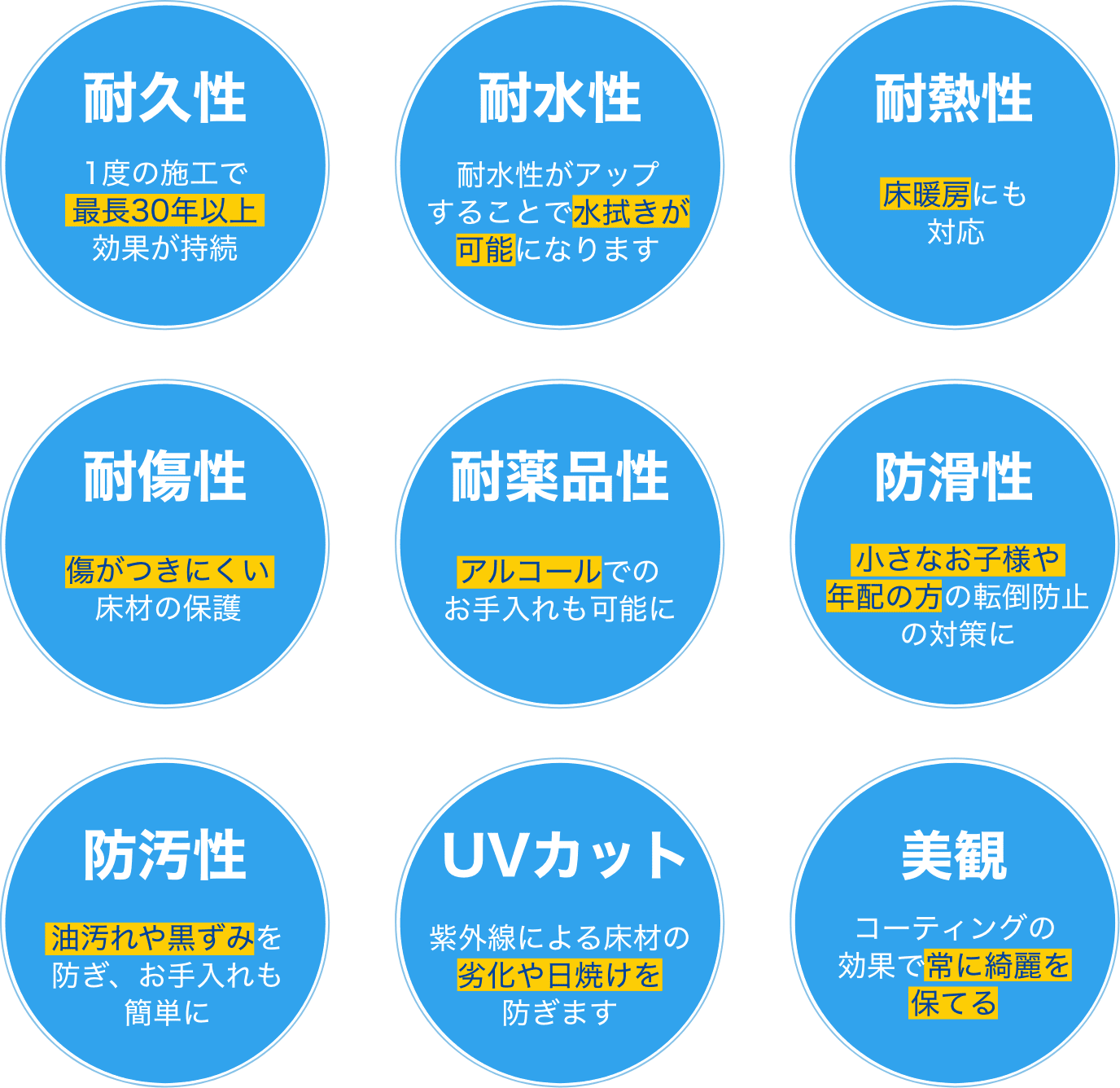 フローリング剤は、傷やひび割れ、太陽光により日焼けやシミなどが発生し、時間と共に劣化していきます。